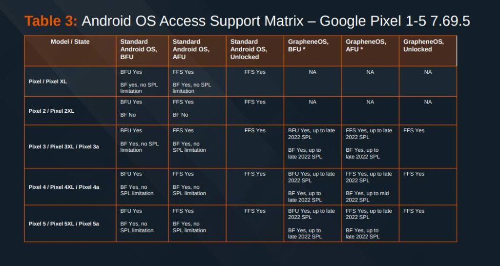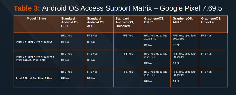 Если же вы рассчитываете, что ваш телефон может «попасть» на стол к «цифровым криминалистам», я рекомендую рассмотреть покупку простенького Google Pixel 8/9 поколения для последующего использования GrapheneOS. Исходя из сообщений «злых таксистов», а также слитой презентации премиальной «открывашки» Cellebrite Premium — «открыть» Pixel 6-ого поколения и выше с GrapheneOS сейчас нельзя.